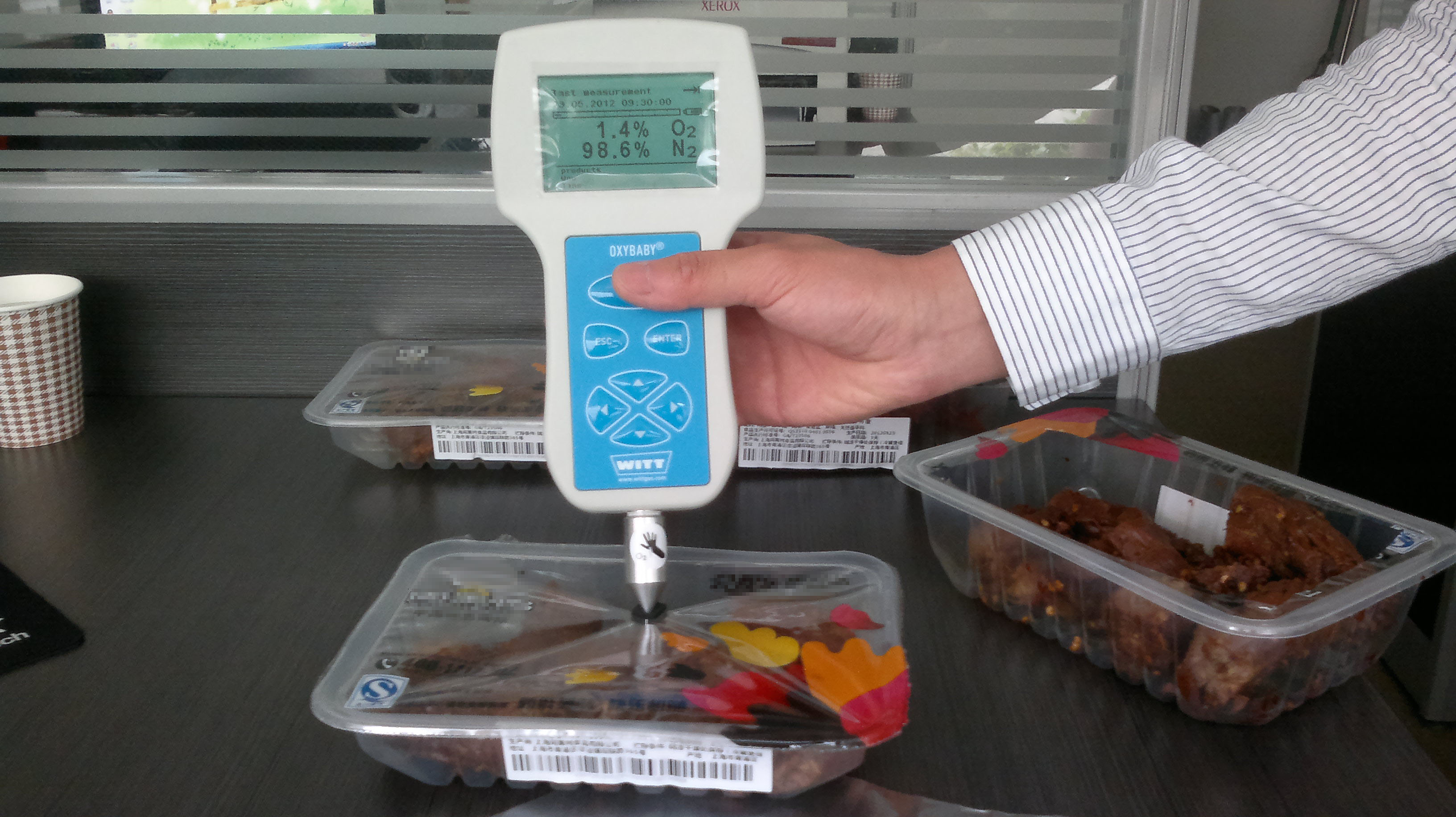 真空包裝形式不但可有效防止肉食品霉變,而且有效的延長貨架期。因熟肉是經(jīng)過殺菌處理的肉食品,若內(nèi)部殘存的微生物與外界氧氣大量接觸會滋生更多有害霉菌,而通過真空包裝則可以效阻止肉制品內(nèi)微生物接觸氧氣,防止霉菌滋生。因此,真空包裝若要達(dá)到理想的防霉變、防脹袋效果,則包裝內(nèi)的氧氣殘留量應(yīng)盡可能控制降低,即應(yīng)達(dá)到較高的真空度。故真空包裝袋內(nèi)的氧氣殘留量是肉制品成品包裝的重要檢測指標(biāo)。